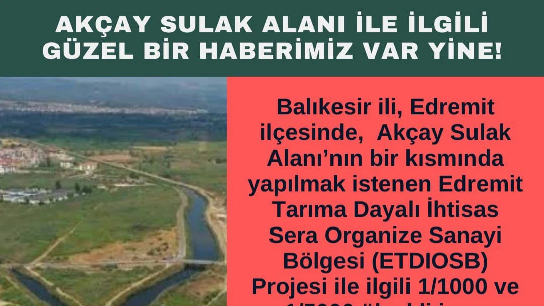 Balıkesir’in Edremit ilçesinde, Akçay Sulak Alanı’nın bir kısmını tehdit eden Edremit Tarıma Dayalı İhtisas Sera Organize Sanayi Bölgesi (ETDİOSB) projesine karşı açılan davada, bilirkişi heyeti imar planlarının iptal edilmesi gerektiği yönünde görüş bildirdi.