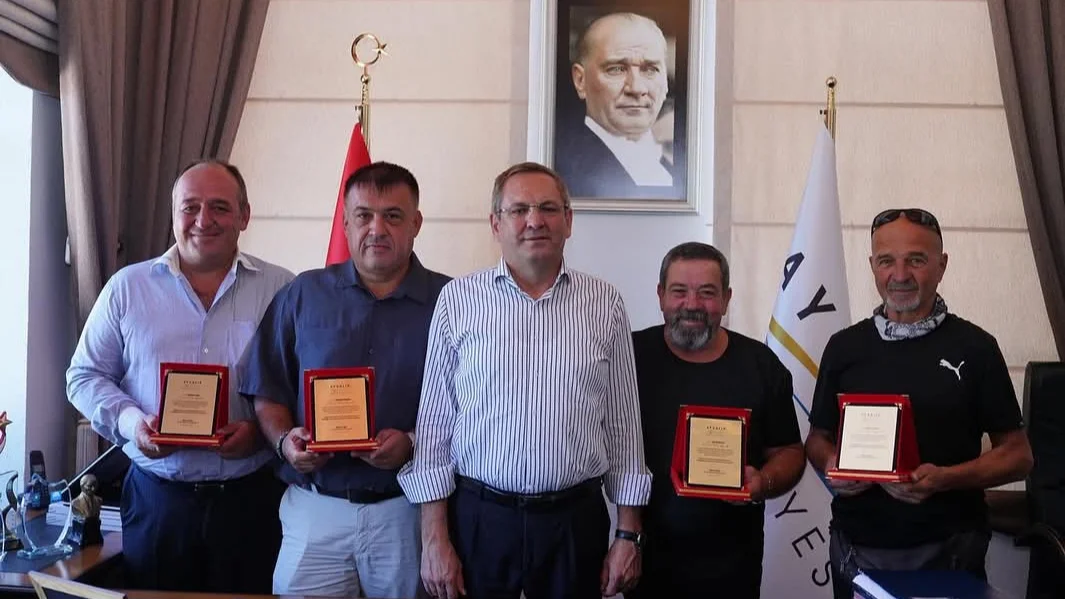 Ayvalık Belediye Başkanı Mesut Ergin, Cunda (Alibey) Adası sahilinde gönüllü olarak deniz dibi temizliği yapan Ayvalıklı dalgıçlara teşekkür ederek, plaket takdim etti.