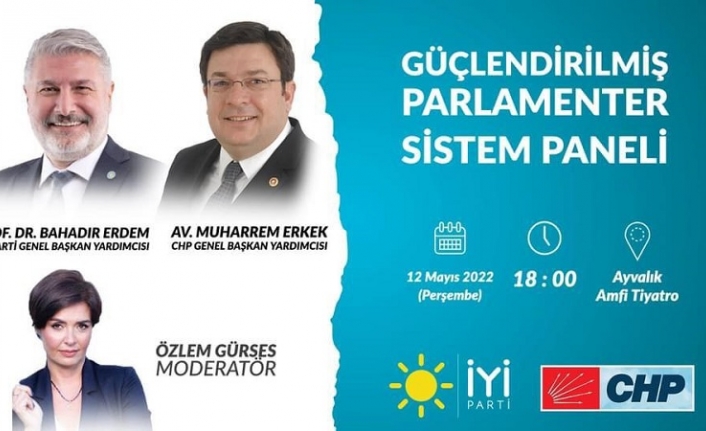 Balıkesir’in Ayvalık ilçesinde, İYİ Parti Genel Başkan Yardımcıları Prof. Dr. Bahadır Erdem ile CHP Genel Başkan Yardımcısı Av. Muharrem Erkek “Güçlendirilmiş Parlamenter Sistemi” anlatmak üzere düzenlenen panele katılacaklar.