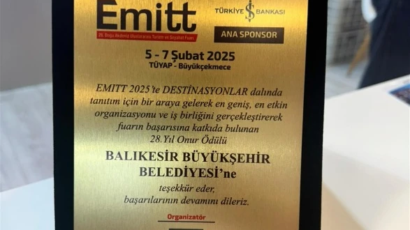 İstanbul TÜYAP Fuar ve Kongre Merkezi’nde 5-7 Şubat 2025 günleri arasında 28’incisi düzenlenen Doğu Akdeniz Uluslararası Turizm ve Seyahat Fuarı’nda (EMITT) Balıkesir Büyükşehir Belediyesi, 28. Yıl Onur Ödülü’ne layık görüldü. Fuarda ilk günden itibaren lezzetli zeytinyağlarından, zengin bal çeşitlerine kadar çok sayıda yöresel değerleriyle ilgi çeken Balıkesir Büyükşehir Belediyesi “Destinasyonlar” kategorisinde yaptığı geniş kapsamlı tanıtım çalışmaları ve iş birlikleriyle bu ödülü almaya hak kazandı.