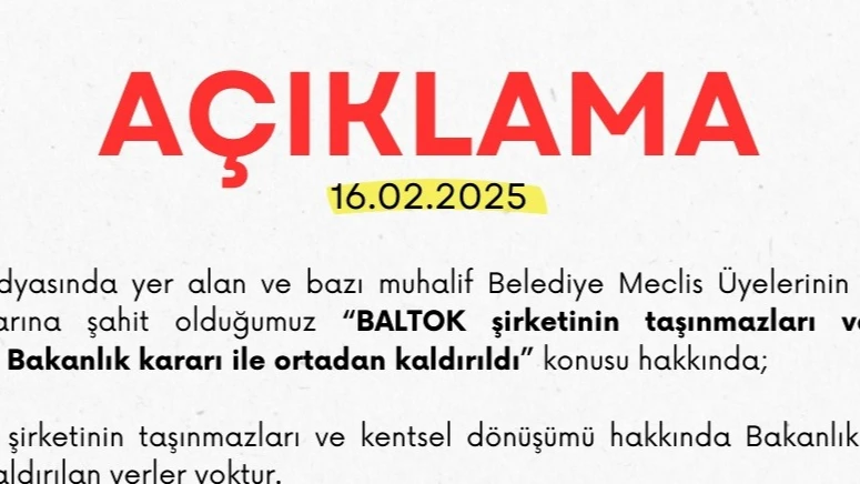 Balıkesir Büyükşehir Belediyesi'nde yapılan açıklamada, "Havuz medyasında yer alan ve bazı muhalif Belediye Meclis Üyelerinin iftira dolu açıklamalarına şahit olduğumuz “BALTOK şirketinin taşınmazları ve kentsel dönüşümü bakanlık kararı ile ortadan kaldırıldı” konusu hakkında;