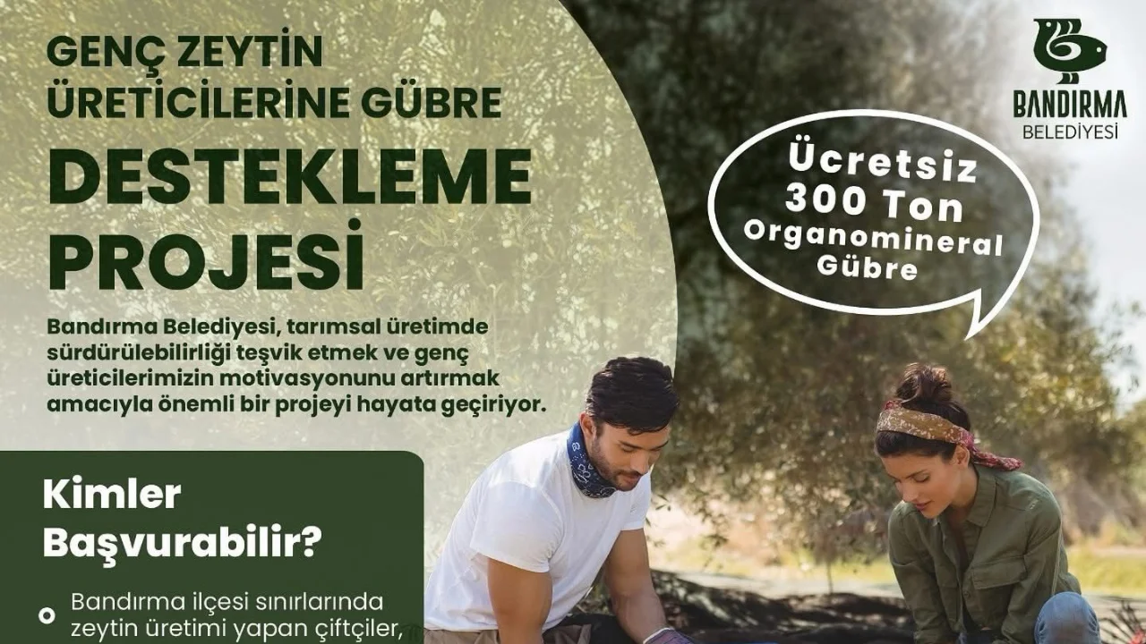 “Genç Üreticilere Destek, Zeytin’e Bereket” mottosuyla duyurulan proje kapsamında, Bandırma ilçesi sınırlarında zeytin üretimi yapan 40 yaş altı çiftçilere tamamen ücretsiz 300 ton organomineral gübre dağıtılacak.