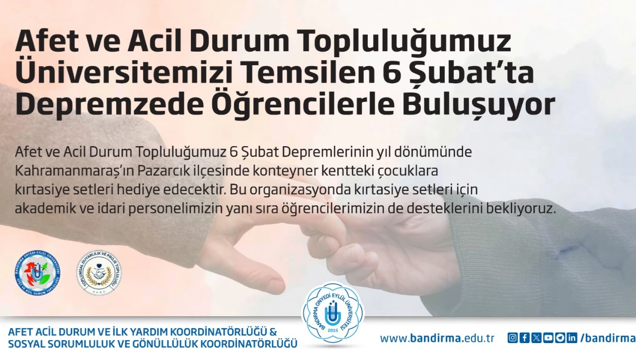 Bandırma Onyedi Eylül Üniversitesi, ''Afet ve Acil Durum Topluluğumuz tarafından 6 Şubat 2023 tarihinde yaşanan depremin yıl dönümü olması sebebiyle Kahramanmaraş’ın Pazarcık ilçesinde bulunan çocuklara yönelik olarak kırtasiye malzemelerini ihtiva eden yardım kampanyası düzenlenecektir.