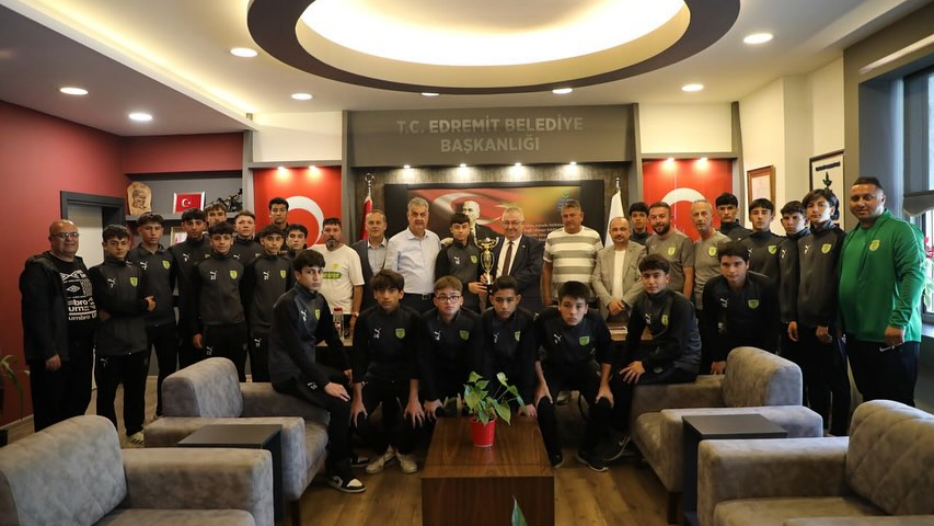 Balıkesir’de düzenlenen finallerde rakiplerini mağlup ederek il şampiyonu olan ve Edremit’imizi Türkiye Şampiyonası’nda temsil etme hakkı kazanan 1966 Edremitspor U-15 takımının başarılı oyuncularıyla belediyede bir araya geldiklerini bildiren Belediye Başkanı Mehmet Ertaş, şunları söyledi: