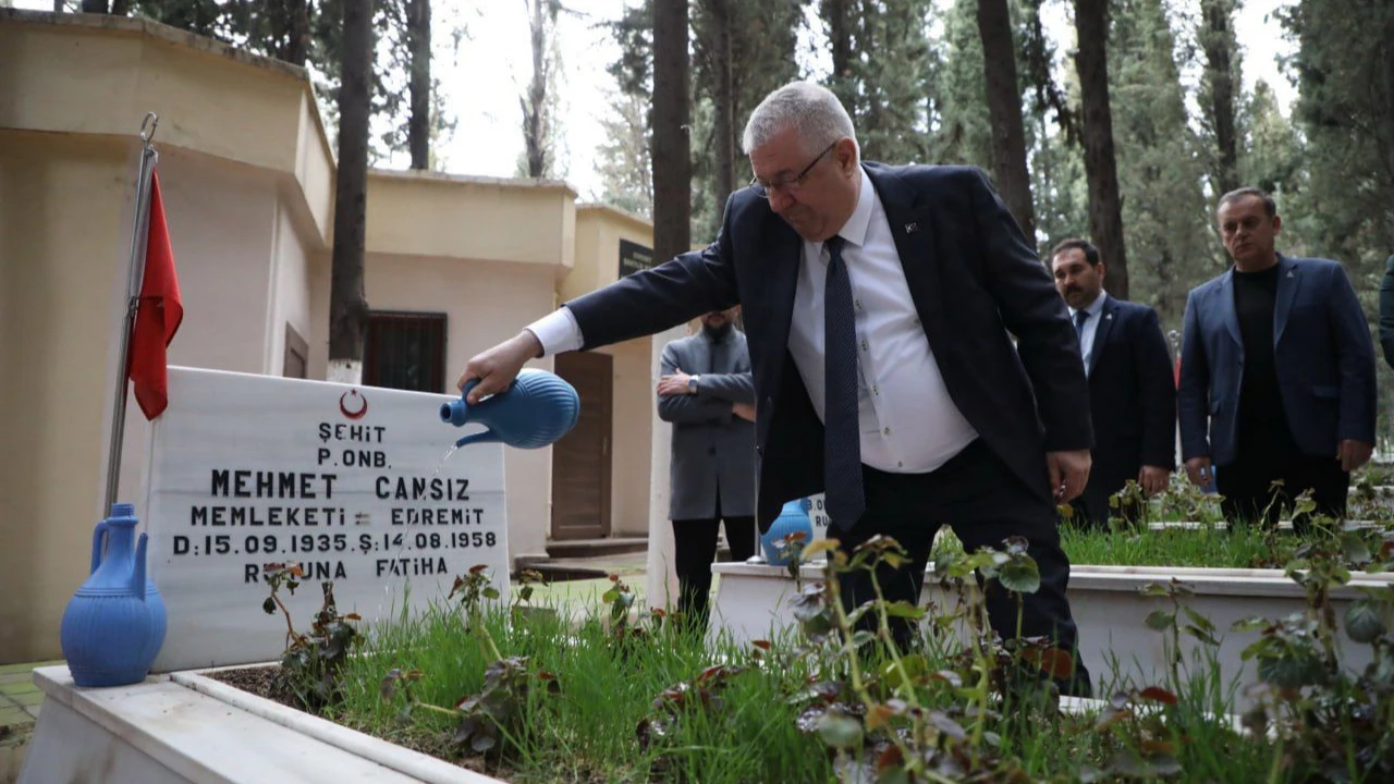 Edremit Belediye Başkanı Mehmet Ertaş, Ramazan öncesi Edremit Şehitliği'ni ziyaret etti. Başkan yardımcıları ve meclis üyelerinin de eşlik ettiği anlamlı ziyarette Başkan Mehmet Ertaş şehitler için dua etti.