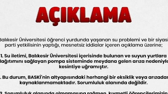 Balıkesir Üniversitesi'nde öğrenci yurtlarında yaşanan su problemi üzerine Balıkesir Su ve Kanalizasyon Dairesi (BASKİ) açıklama yaptı.