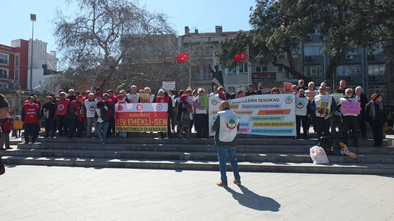 Burhaniye de ellerinde pankartlarla Cumhuriyet Meydanında toplanan Tüm Emeklilerin Sendikasına, Dev Emekli Sen de destek verdi. Tüm Emeklilerin Sendikası Şube Başkanı Nadir Devrin Şahin, yaptığı açıklama da, emekli maaşlarının ve bayram ikramiyelerinin artırılmasını istedi. Şahin açıklamasında, “Sıra emeklileri gelince para yok dediler. Gabar’da petrol buyacağız dediler olmadı.