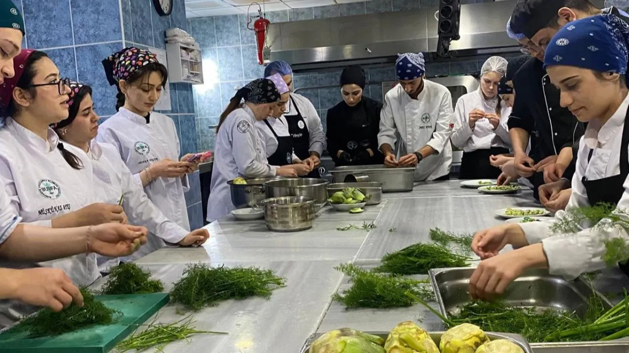 Uygulamalı Bilimler Fakültesi Mutfağındaki etkinlikte, gastronomide sürdürülebilirlik yaklaşımının önemli bir parçası olan yerel ve nitelikli ürün kullanımına dikkat çekilerek öğrencilerin bu bilinçle değerlendirme yapmaları hedeflendi. İlk aşamada öğrenciler, farklı coğrafyalarda yetiştirilen üç ayrı zeytinyağını tanıma ve değerlendirme fırsatı buldu. Ayvalık, Yamalak Sarısı ve Trilye zeytinlerinden elde edilen zeytinyağlarının aroma, koku ve tat özellikleri karşılaştırmalı olarak incelendi. Tadım sürecinin ardından öğrenciler üç gruba ayrılarak uygulama aşamasına geçti. Her grup, farklı zeytinyağları kullanarak enginar dolması hazırladı. Uygulama boyunca öğrenciler, kullanılan zeytinyağlarının yemeğe kattığı aroma, lezzet ve karakter farklılıklarını birebir deneyimleme fırsatı bulurken, aynı yemeğin farklı ürünlerle nasıl değişebildiğini gözlemledi. Bu süreç, uygulamalı öğrenme deneyimini zenginleştirerek mesleki becerilerinin gelişimine katkı sundu.
