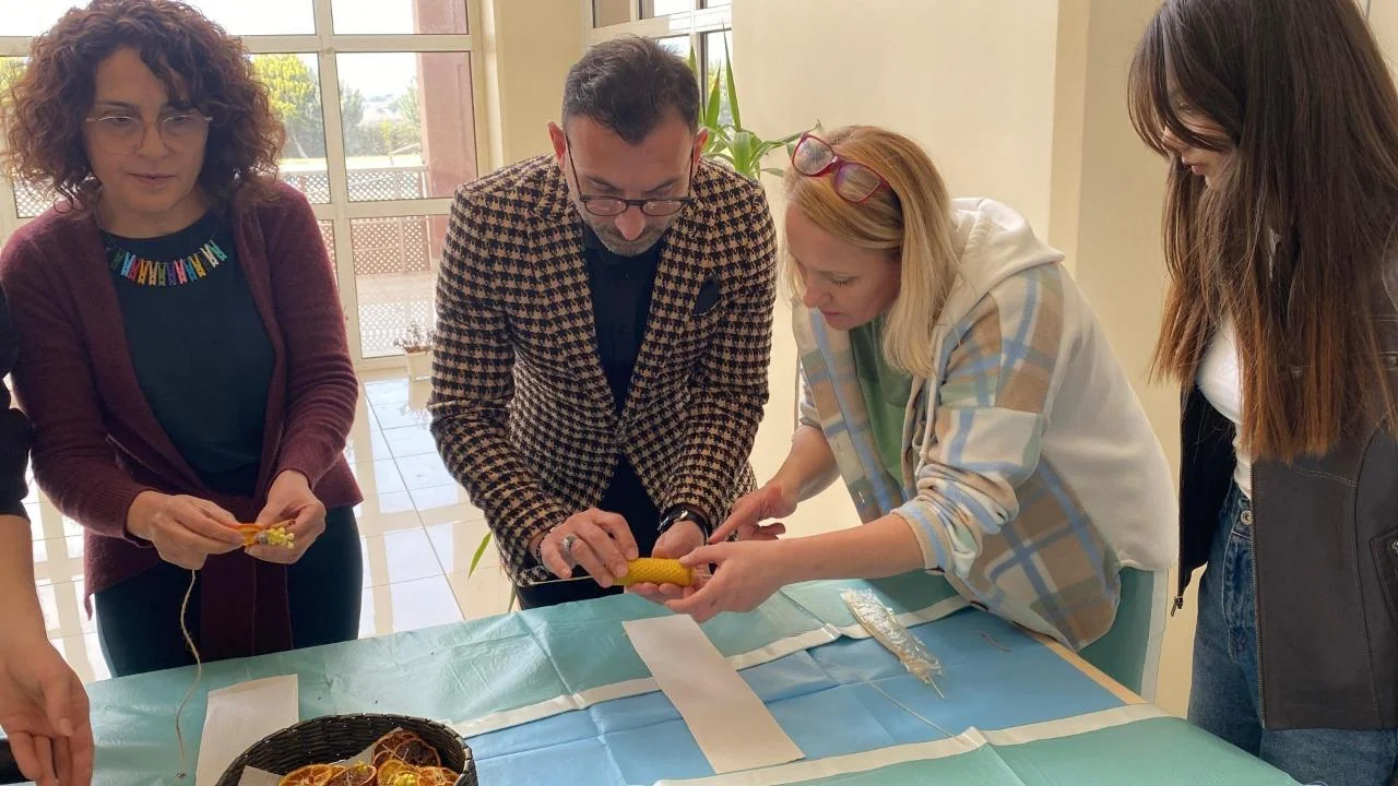 Etkinlik kapsamında öğrenciler, doğal bal mumunu kullanarak geleneksel yöntemlerle kendi mumlarını üretme deneyimi yaşadı.