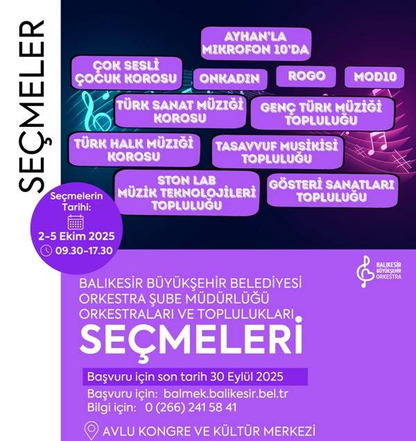 Balıkesir Büyükşehir Belediyesi Orkestra Şube Müdürlüğü Orkestraları ve Toplulukları için yapılacak olan seçmelerde başvuruların sona ermesinin ardından 2-5 Ekim günlerinde 9.30-17.30 saatleri arasında Avlu Kongre ve Kültür Merkezinde başvuru yapan adaylar arasından seçmeler yapılacak. Başvurular balmek.balikesir.bel.tr adresinden gerçekleştirilecek. Mod10 Gençlik Orkestrası, Onkadın Orkestrası, Rogo Roman Gençlik Orkestrası, Türk Sanat Müziği Korosu, Türk Halk Müziği Korosu, Ayhan Erden ile Mikrofon 10’da, Genç Türk Müziği Topluluğu, Çok Sesli Çocuk Korosu, Gösteri Sanatları Topluluğu, Tasavvuf Musikisi Topluluğu, Ston Lab Müzik Teknolojileri Topluluğu olmak üzere toplamda 11 farklı kategorideki korolarde yer almak isteyenler başvurularını gerçekleştirebilecek.