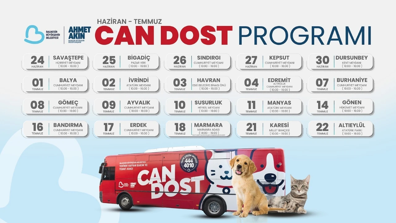 Balıkesir’de ilçe ilçe dolaşarak sokak hayvanlarına ücretsiz tedavi desteği sağlayan mobil hayvan bakım ve tedavi aracı “Can Dost” un, Haziran-Temmuz ayı takvimi belli oldu. “Can Dost”, farklı ilçelerde belirli günlerde sokak hayvanlarına kuduz aşısı ve parazit uygulaması yapmasının yanı sıra can dostlara tedavi hizmeti de veriyor.