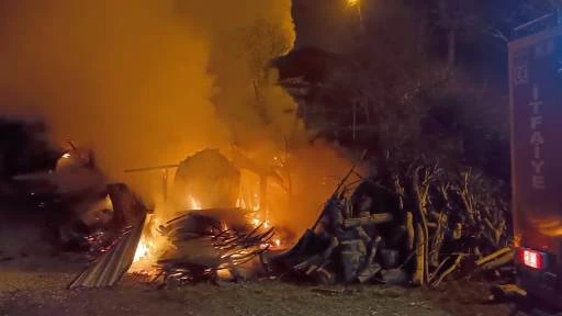 Balıkesir’in Dursunbey ilçesinde odunlukta çıkan ve kısa sürede büyüyen yangın içeride bulunan otomobilinde yanmasına neden oldu.