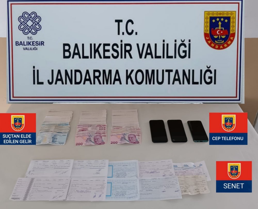 Edinilen bilgiye göre, Balıkesir İl Jandarma Komutanlığı ekipleri, ilçede örgütlü olarak tefecilik yaptıkları tespit edilen kişileri takibe alındı. Kendilerinden borç para alan kişilere boş senet imzalatarak yüksek miktarda faiz uyguladıkları iddia edilen ve şahısların borçlarını ödeyemeyen kişileri baskı, şiddet ve tehdit etmek suretiyle haksız kazanç elde ettikleri belirlendi. 3 şüphelinin adreslerinde yapılan aramalarda 11 adet açık senet, 3 adet telefon ve suçtan elde edilen 50 bin TL ele geçirildi. Olayla ilgili ekiplerin çok yönlü araştırmasının sürdüğü haksız kazanç sağlayanlar ile ilgili mücadelesinin sürdüğü öğrenildi.