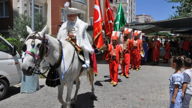 Küçük Muhammed Hamza, sünnet kıyafetleriyle at üzerinde mehter takımı eşliğinde tur atarken gurur dolu bakışlarla etrafını izliyordu.
