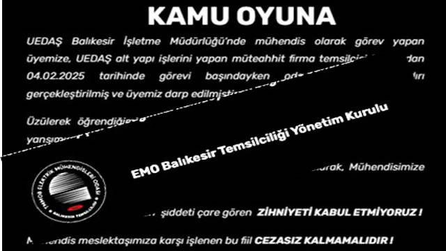Elektrik Mühendisleri Odası (EMO) Balıkesir Temsilciliği, 4 Şubat 2025 tarihinde UEDAŞ Balıkesir İşletme Müdürlüğü’nde görevli bir mühendislerine yönelik gerçekleştirilen fiziksel saldırıyı kınadı.