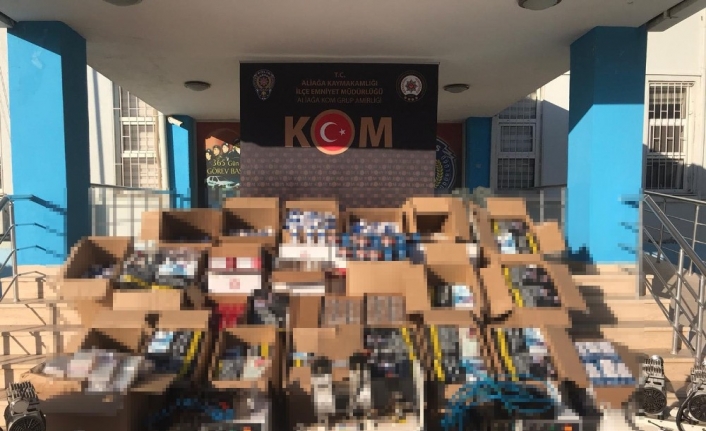 Edinilen bilgiye göre, Aliağa İlçe Emniyet Müdürlüğü Kaçakçılıkla Mücadele Grup Amirliği sorumluluk bölgesinde bulunan Menemen ilçesinde, tütün ve bundan üretilen kaçak sigara faaliyetlerinin önlenmesine yönelik olarak yapılan çalışmalar kapsamında bir iş yerinde arama yapıldı. 20’li paketler içerisinde toplamda 2 bin 200 adet içi tütün ile doldurulmuş makaron ele geçirildi. Olayla ilgili olarak bir şüphelinin ikametinde yapılan aramada ise 58 bin 650 adet kıyılmış tütünle doldurulmuş makaron, 13 bin adet şeffaf poşet 9 bin 075 paket boş sigara kutusu, 56 bin 400 adet boş makaron, 2 adet sigara doldurma makinesi, 3 adet kompresör, 580 adet kopartılmış TAPDK bandrolü bulundu.