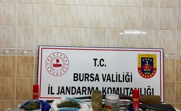 Bursa İl Jandarma Komutanlığına bağlı ekiplere ulaşan uyuşturucu madde ticareti ihbarı üzerine düzenlenen eş zamanlı operasyonda 3 farklı adrese baskın yapıldı. Operasyona jandarma kaçakçılık ve organize suçlarla mücadele şubesi, İnegöl JASAT, Yeniceköy Jandarma Komutanlığı ve Hamzabey Jandarma Komutanlığı ekipleri katıldı. Adreslerde M.T., H.E. ve M.G. gözaltına alındı. İkametlerde yapılan aramalarda ise 4 adet uyuşturucu kullanma aparatı, 1 adet uyuşturucu kullanım aparatı yapımında kullanılan pürmüz, 2 adet ruhsatsız av tüfeği, 10 gram metamfetamin, 2 adet Fişek, 10 gram toz esrar, 1227 gram kubar esrar, 5 gram selvia diye tabir edilen uyuşturucu madde ve uyuşturucu kullanım aparatı yapımında kullanılan 2 adet çakmak gazı ele geçirildi.