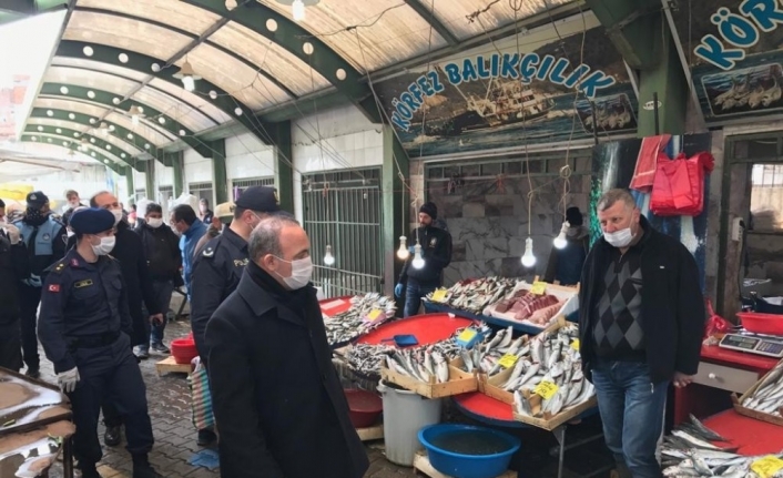 Burhaniye’de Kaymakam Hüseyin Öner, Halk Pazarına denetime çıktı. Polis ve zabıta ekiplerinin aldıkları tedbirleri inceleyen Öner, pazar esnafı ve vatandaşları sosyal mesafe konusunda uyardı.