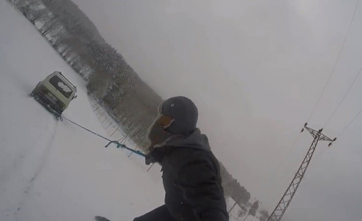 Bursa’nın İznik ilçesindeki dağ köylerinde kar 2 metreyi buldu. Köy yolunda araç arkasına iple tutunarak snowboard yapan gençlerin görüntüsü ilgiyle izlendi.