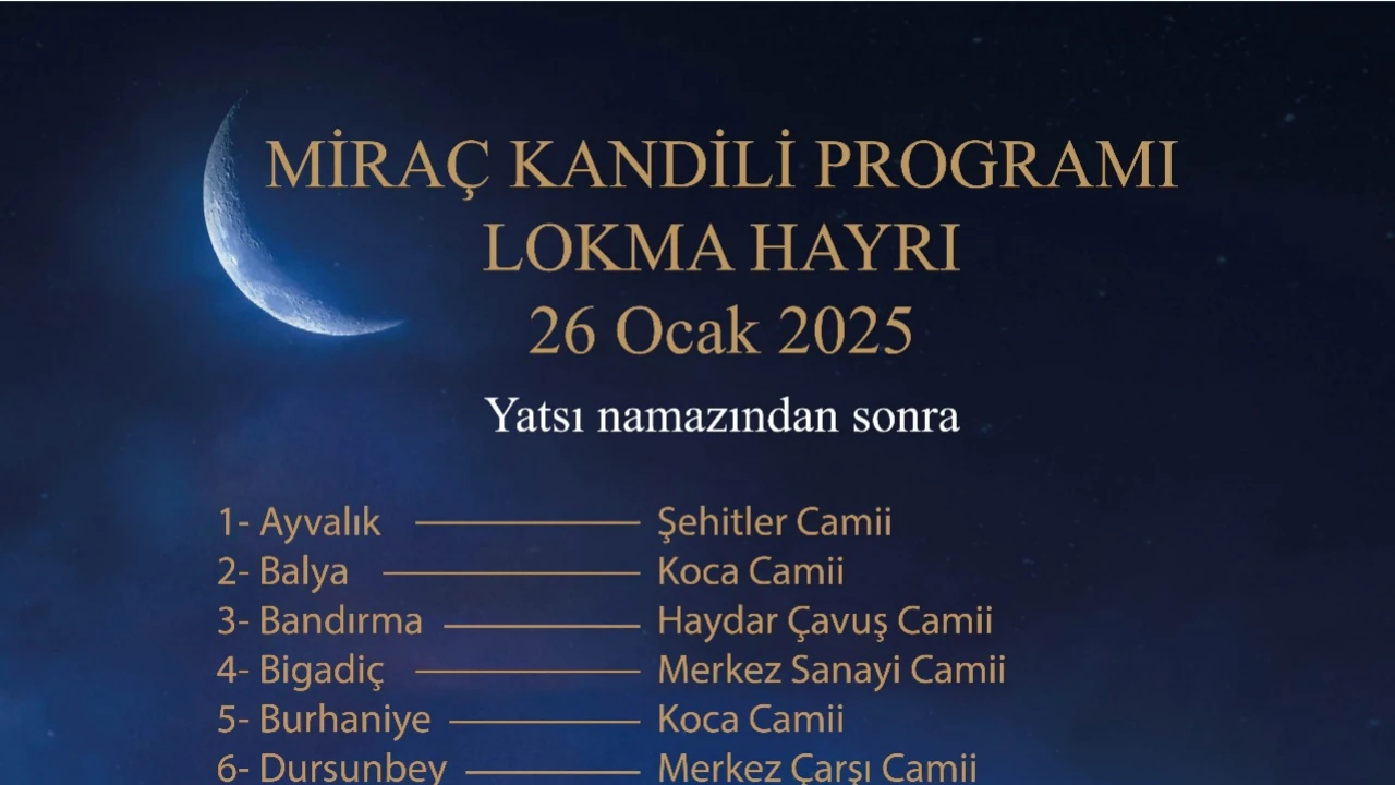 Tüm ilçelerde yatsı namazından sonra lokma hayrı düzenleyecek olan Balıkesir Büyükşehir Belediyesi; Ayvalık Şehitler Camii, Balya Koca Camii, Bandırma Haydar Çavuş Camii, Bigadiç Merkez Sanayi Camii, Burhaniye Koca Camii, Edremit Bekir Efendi, Erdek Çarşı Camii ve Gömeç Çarşı Camii önünde stant kurarak lokma ikramında bulunacak. Lokma ikramı ayrıca Gönen Çarşı Camii, Havran Camii Kebir, İvrindi Alan Camii, Kepsut Çarşı Camii, Manyas Çarşı Camii, Marmara Avşa Merkez Camii ve Avşa Fatih Camii, Savaştepe Merkez Çarşı Camii, Sındırgı Şerif Paşa Camii ve Susurluk Çarşı Camii’nde de yapılacak.