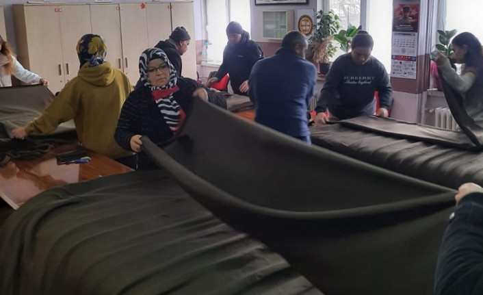 İl Millî Eğitim Müdürlüğü bünyesindeki Halk Eğitimi Merkezleri usta öğretici ve kursiyerleri yürekleri biraz da olsa ısıtabilmek adına gece gündüz çalışarak deprem bölgesine gönderilmek üzere üretim faaliyetlerini sürdürüyor.