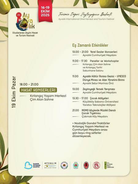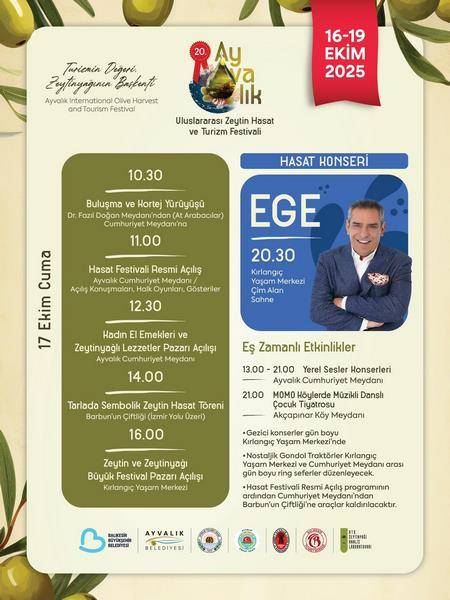 Ayvalık Ticaret Odası, Balıkesir Büyükşehir Belediyesi, Ayvalık Belediyesi, Ayvalık Ziraat Odası, Ayvalık Esnaf Birliği ve ATO Zeytinyağı Analiz Laboratuvarı iş birliğiyle düzenlenen 20. Ayvalık Uluslararası Zeytin Hasat ve Turizm Festivali, dopdolu bir programla16-9 Ekim 2025 tarihleri arasında gerçekleştirilecek. Ayvalık Belediye Başkanı Mesut Ergin, Festivalin, yalnızca zeytinin değil, aynı zamanda “tarih, doğa, mimari ve lezzet kenti” Ayvalık’ın da tanıtımına büyük katkı sağladığını ve hizmet ettiğini söyledi.