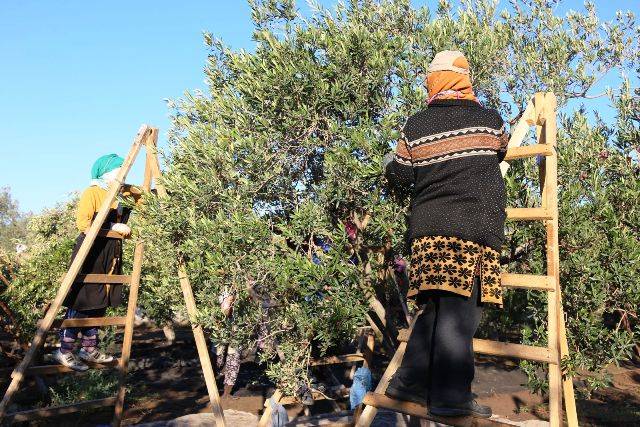 Zeytin toplayıcıları, ağaçların dallarındaki zeytinleri büyük bir özen ve şevkle, çoğunlukla kadın çiftçilerin emeğiyle elle topladı.