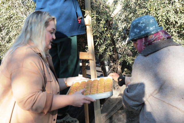 Hasat töreninde, hoca eşliğinde yapılan duaların ardından zeytin toplayıcıları ilk zeytinleri dalından topladı. Çiftçiler, geleneksel olarak sofranın olmazsa olmazı tatlıyı paylaşarak bereketli bir sezon için dileklerde bulundu.